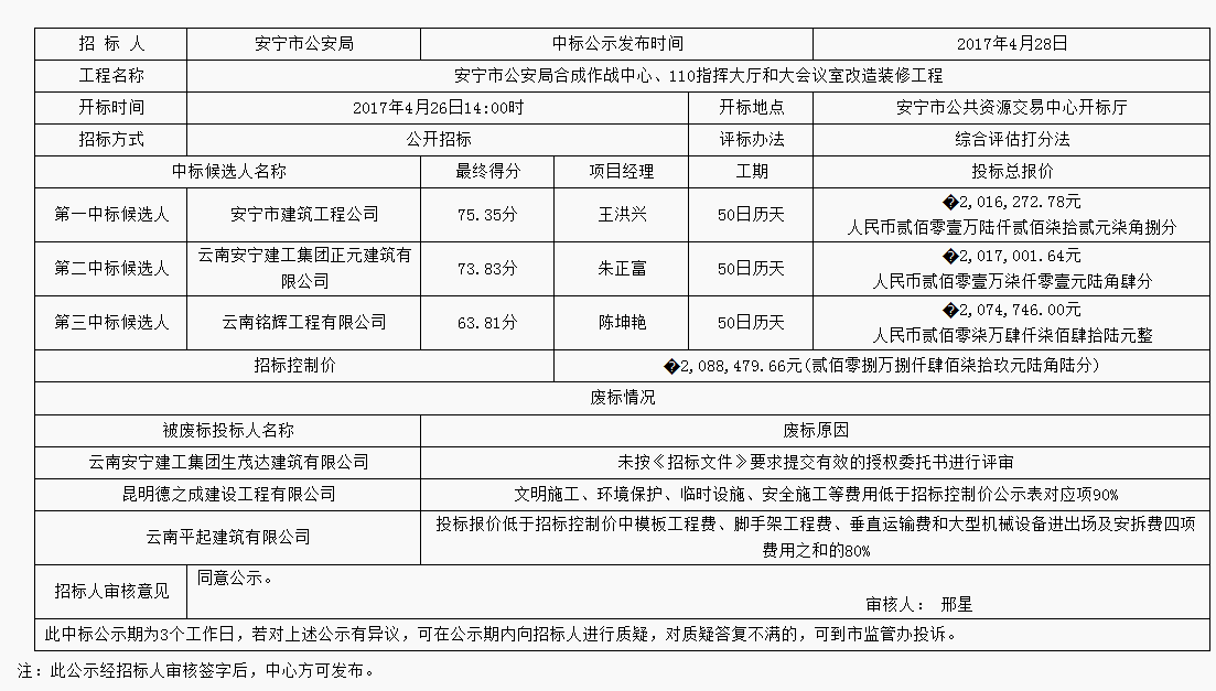 安宁市公安局合成作战中心、110指挥大厅和大会议室改造装修工程评标结果公示