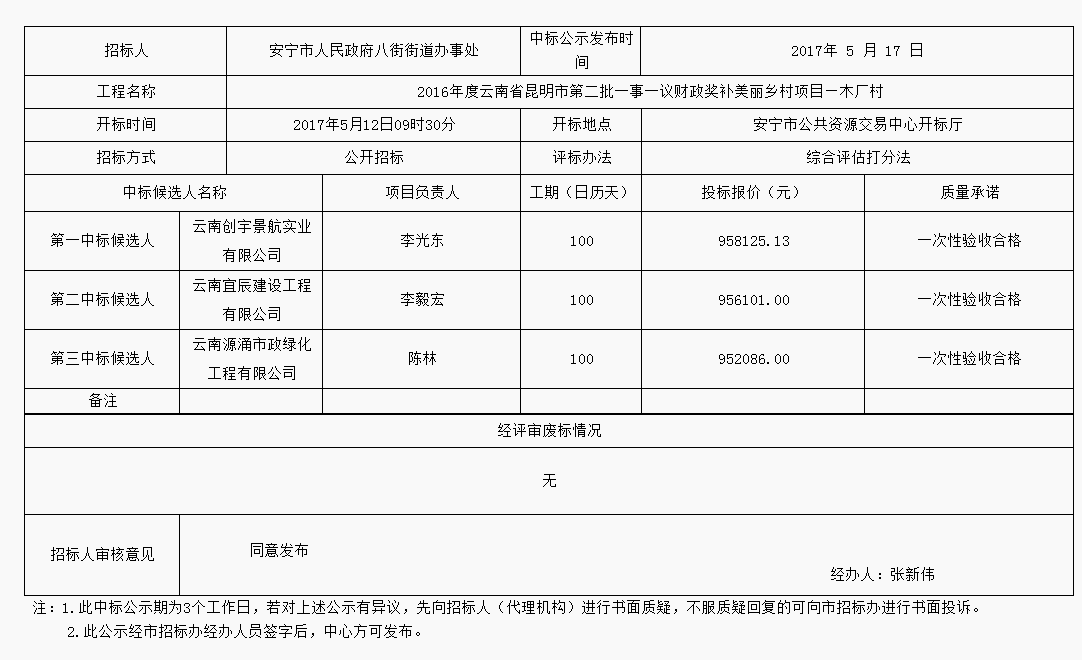 2016年度云南省昆明市第二批一事一议财政奖补美丽乡村项目—木厂村评标结果公示