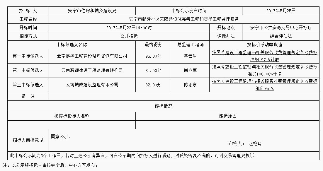安宁市新建小区无障碍设施完善工程和零星工程监理服务评标结果公示 Copy1