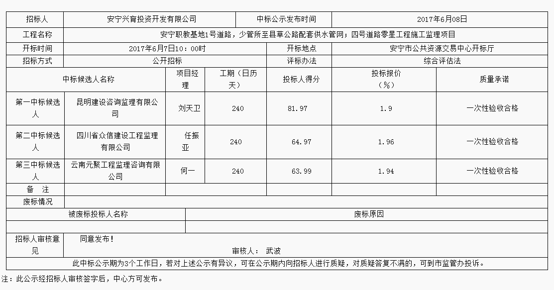 安宁职教基地1号道路,少管所至县草公路配套供水管网;四号道路零星工程施工监理项目评标结果公示