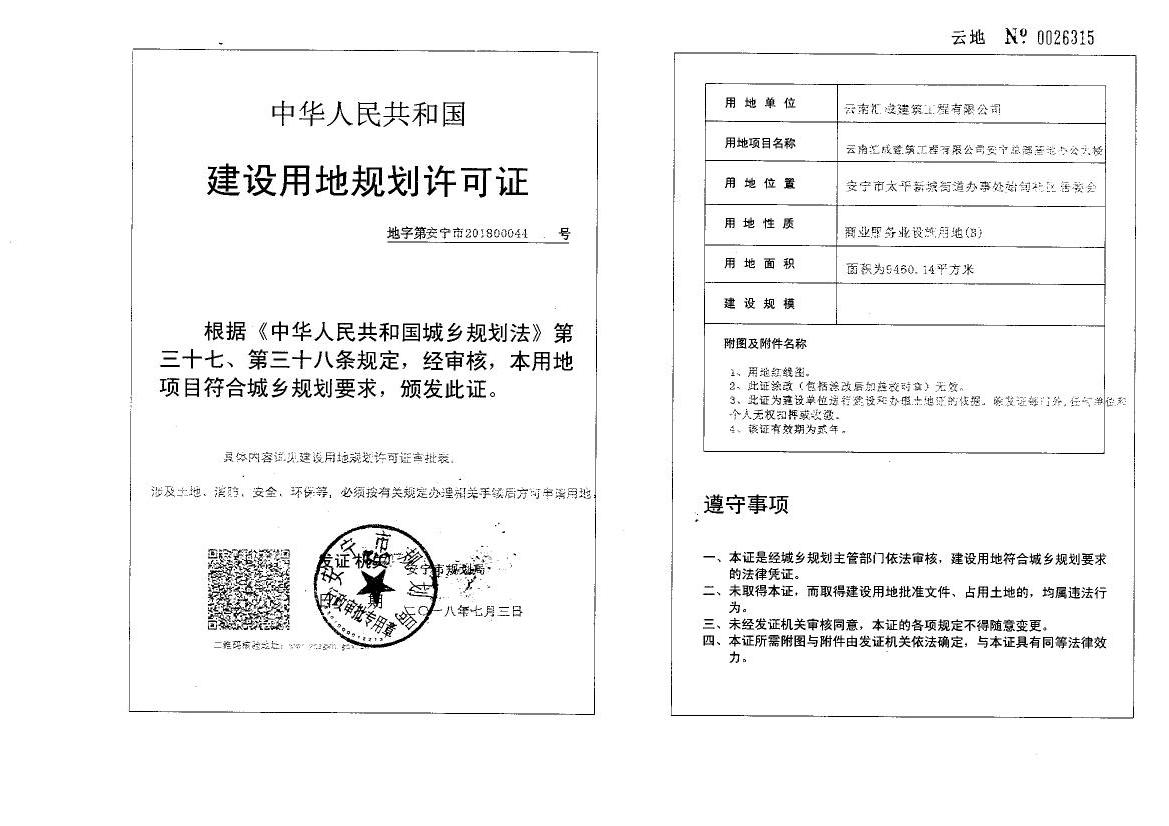 云南汇成建筑工程有限公司安宁总部基地办公大楼建设用地规划许可证44号