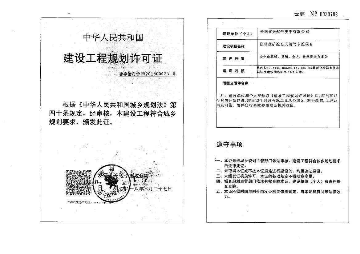 昆明盐矿配套天然气专线项目建设工程规划许可证33号