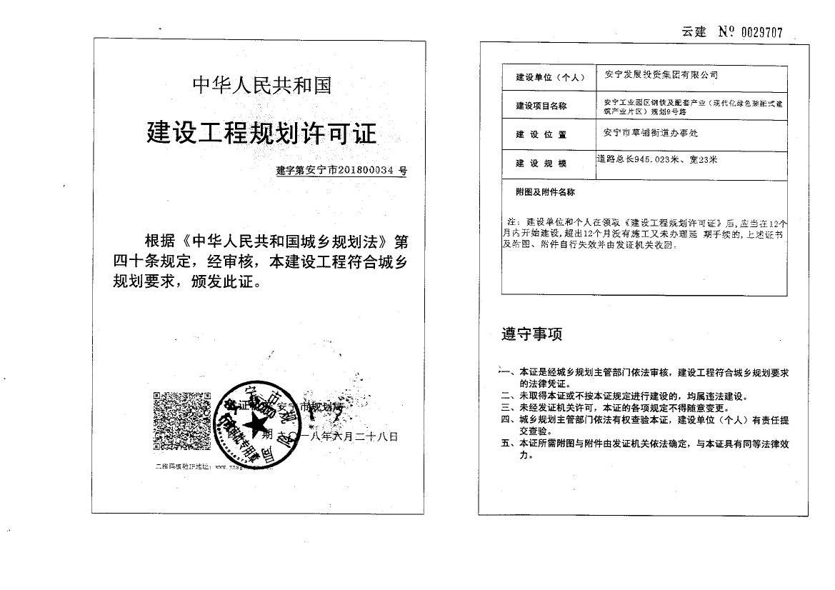 安宁市工业园区钢铁及配套产业(现代化绿色装配式建筑产业片区)规划9号路建设工程规划许可证34号