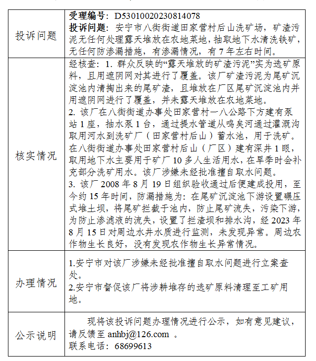 云南省第二轮生态环境保护督察交办的投诉问题办结情况公示表(20230814078)