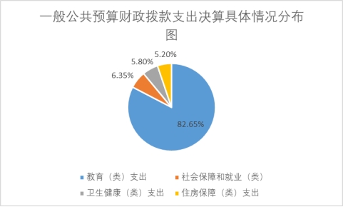 5.教育(类)支出19,868,758.61元,占一般公共预算财政拨款总支出的82.65%。主要用于教育管理事务方面,工资福利支出、商品和服务支出、对个人和家庭补助支出等;