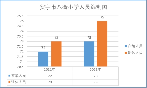 安宁市八街小学2022年末实有人员编制73人。其中:行政编制0人(含行政工勤编制0人),事业编制73人(含参公管理事业编制0人);在职在编实有行政人员0人(含行政工勤人员0人),事业人员73人(含参公管理事业人员0人)。