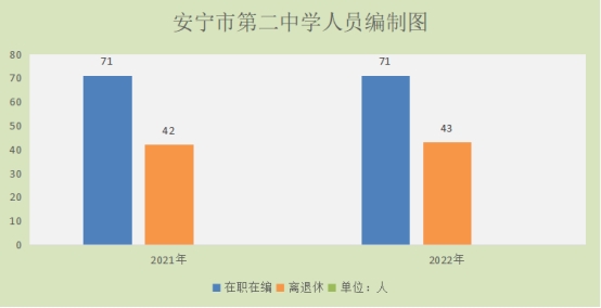 安宁市第二中学2022年末实有人员编制71人。其中:行政编制0人(含行政工勤编制0人),事业编制71人(含参公管理事业编制0人);在职在编实有行政人员0人(含行政工勤人员0人),事业人员71人(含参公管理事业人员0人)。