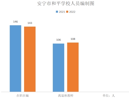安宁市和平学校2022年末实有人员编制143人。其中:行政编制0人(含行政工勤编制0人),事业编制143人(含参公管理事业编制0人);在职在编实有行政人员0人(含行政工勤人员0人),事业人员143人(含参公管理事业人员0人)。