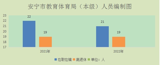 安宁市教育体育局(本级)2022年末实有人员编制21人。其中:行政编制19人(含行政工勤编制2人),事业编制2人(含参公管理事业编制0人);在职在编实有行政人员19人(含行政工勤人员2人),事业人员2人(含参公管理事业人员0人)。
