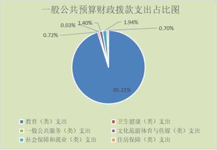 5.教育(类)支出48,414,162.17元,占一般公共预算财政拨款总支出的95.21%。主要用于教育管理实务、学前教育、小学教育、初中教育、 高中教育、职业教育、城市中小学校舍建设、其他教育支出、人员运维资金和工作经费等;