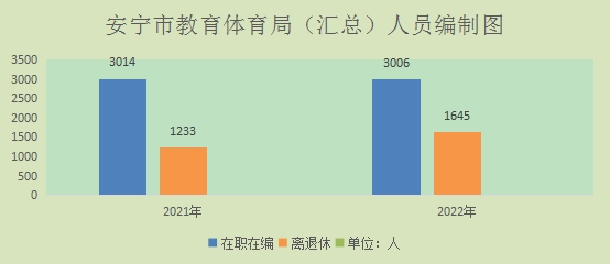安宁市教育体育局(汇总)2022年末实有人员编制3,006人。其中:行政编制19人(含行政工勤编制2人),事业编制2,987人(含参公管理事业编制0人);在职在编实有行政人员19人(含行政工勤人员2人),事业人员2,987人(含参公管理事业人员0人)。