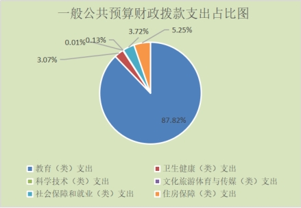 5.教育(类)支出869,751,075.55元,占一般公共预算财政拨款总支出的87.82%。主要用于教育管理实务、学前教育、小学教育、初中教育、 高中教育、职业教育、城市中小学校舍建设、其他教育支出、人员运维资金和工作经费等;