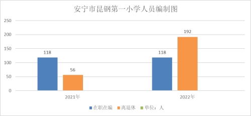 安宁市昆钢第一小学2022年退休教师人数192人,与上年对比增加136人,其中:正常退休教师56人;昆钢剥离退休教师136人,于2022年并入本单位。