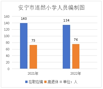 安宁市连然小学2022年末实有人员编制134人。其中:行政编制0人(含行政工勤编制0人),事业编制134人(含参公管理事业编制0人);在职在编实有行政人员0人(含行政工勤人员0人),事业人员134人(含参公管理事业人员0人)。