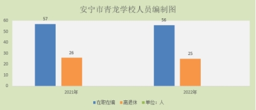 安宁市青龙学校2022年末实有人员编制56人。其中:行政编制0人(含行政工勤编制0人),事业编制56人(含参公管理事业编制0人);在职在编实有行政人员0人(含行政工勤人员0人),事业人员56人(含参公管理事业人员0人)。