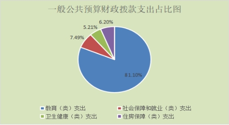 5.教育(类)支出13,909,250.74元,占一般公共预算财政拨款总支出的81.10%。主要用于教育管理事务方面,工资福利支出、商品和服务支出、对个人和家庭补助支出等;