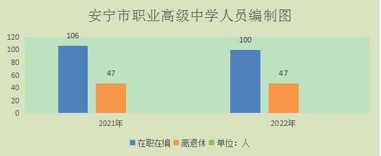 安宁市职业高级中学2022年末实有人员编制100人。其中:行政编制0人(含行政工勤编制0人),事业编制100人(含参公管理事业编制0人);在职在编实有行政人员0人(含行政工勤人员0人),事业人员100人(含参公管理事业人员0人)。