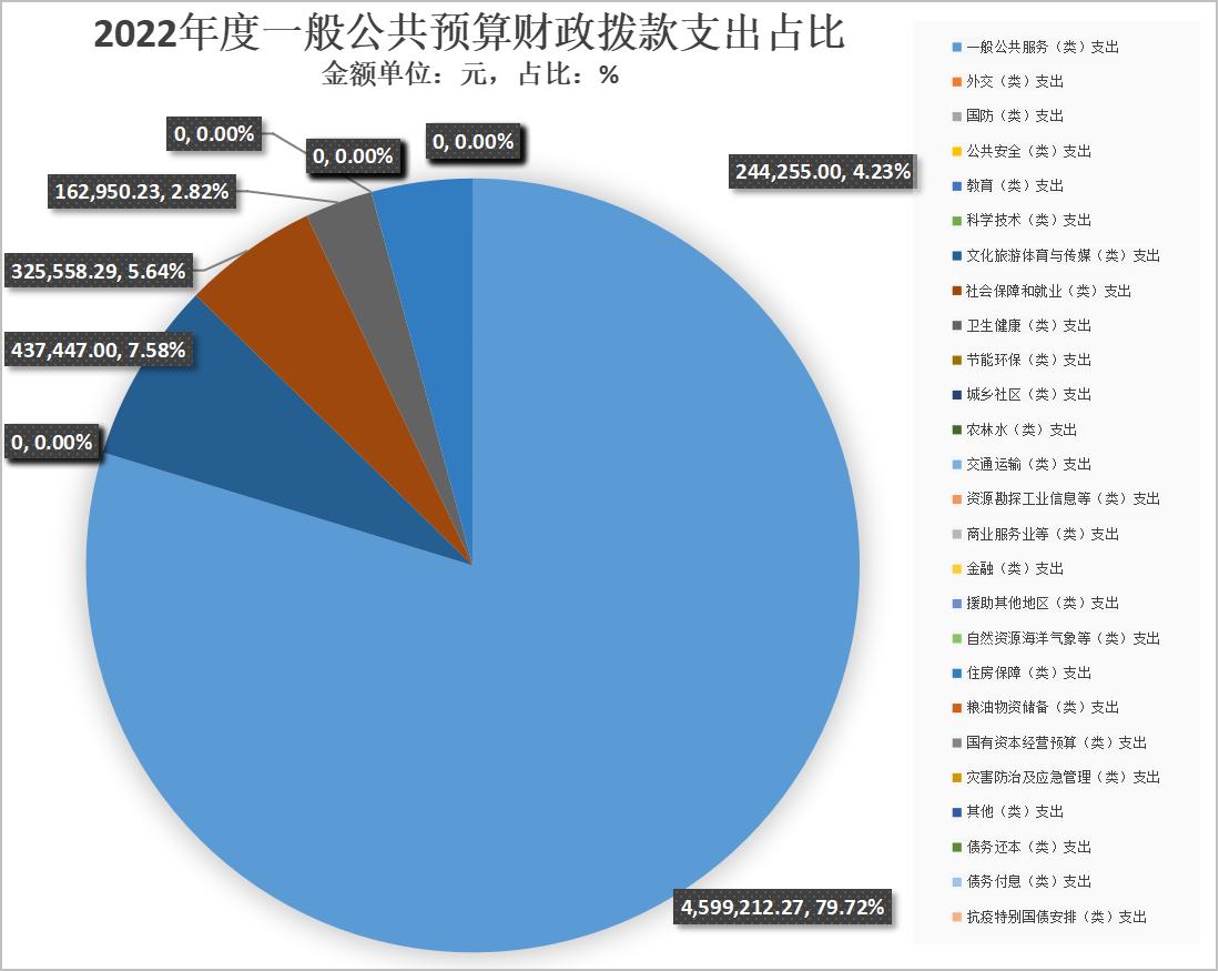 1.一般公共服务(类)支出4,599,212.27元,占一般公共预算财政拨款总支出的79.72%。主要用于一般行政管理事务支出2,502,831.28元、行政运行支出2,079,770.99元、事业运行16,610.00元;