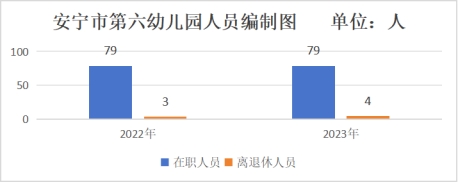 安宁市第六幼儿园2023年末实有人员编制79人。其中:行政编制0人(含行政工勤编制0人),事业编制79人(含参公管理事业编制0人);在职在编实有行政人员0人(含行政工勤人员0人),参照公务员法管理事业人员0人,非参公管理事业人员79人。