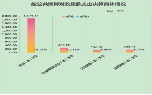 5.教育(类)支出1,874.14万元,占一般公共预算财政拨款总支出的76.25%。主要用于一是教师工资、奖金、绩效等人员经费;二是日常教学业务与管理、教师培训、水电、教学仪器及设备、办公用品、校舍设备维修维护、学生保险及体检费、学生学习实践活动费、校园安全、校园绿化等教育教学活动公用支出;三是对班主任、学科带头人骨干教师工作经费及嘉奖人员的奖励的对家庭及个人补助支出;四是教学用信息网络构建支出;