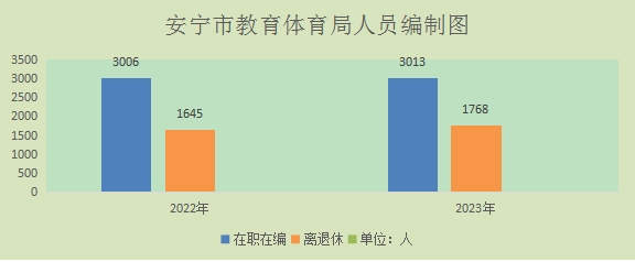 安宁市教育体育局(汇总)2023年末实有人员编制3013人。其中:行政编制17人(含行政工勤编制2人),事业编制2996人(含参公管理事业编制0人);在职在编实有行政人员17人(含行政工勤人员2人),参照公务员法管理事业人员0人,非参公管理事业人员2996人。