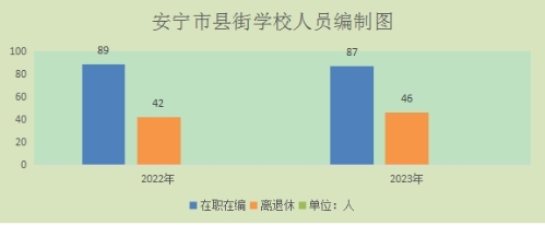 安宁市县街学校2023年末实有人员编制87人。其中:行政编制0人(含行政工勤编制0人),事业编制87人(含参公管理事业编制0人);在职在编实有行政人员0人(含行政工勤人员0人),参照公务员法管理事业人员0人,非参公管理事业人员87人。