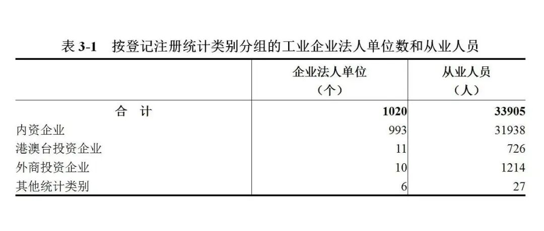 在工业企业法人单位从业人员中,内资企业31938人,占94.2%;港澳台投资企业726人,占2.1%;外商投资企业1214人,占3.6%;其他统计类别27人,占0.1%(详见表3-1)。