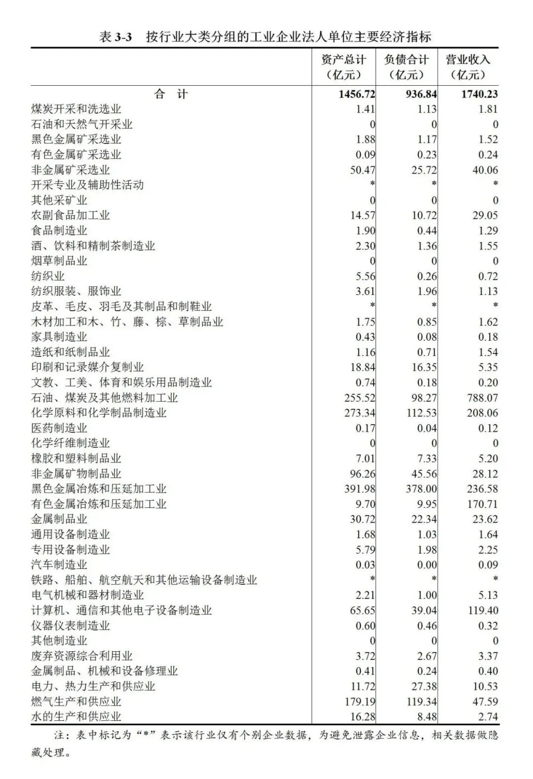 在工业企业法人单位中,采矿业90个,制造业893个,电力、热力、燃气及水生产和供应业37个,分别占8.8%、87.6%和3.6%。在工业行业大类中,非金属矿物制品业、金属制品业、化学原料和化学制品制造业企业法人单位数位居前三位,分别占21.1%、16.3%和8.4%。