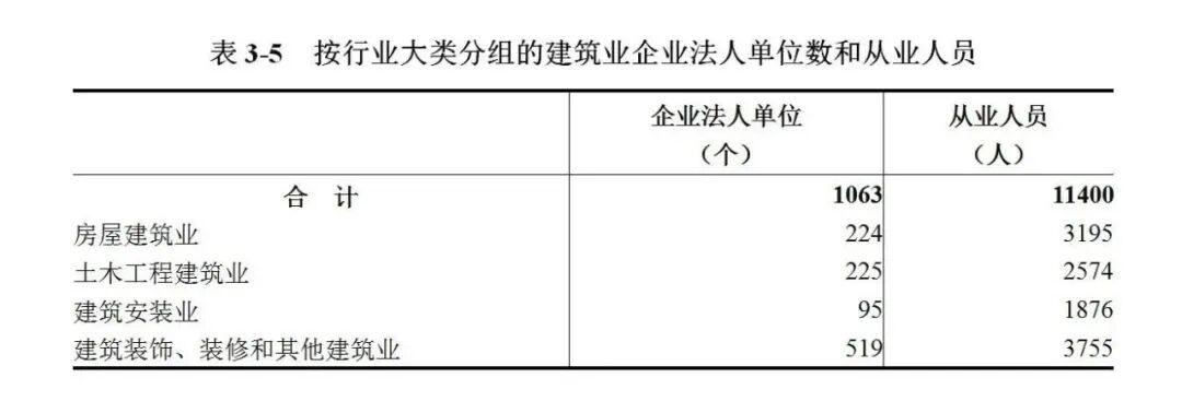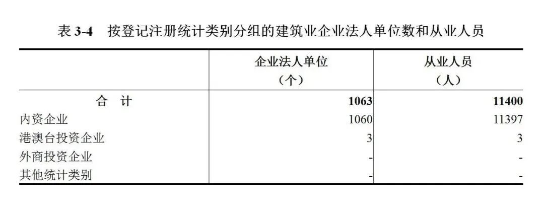 建筑业企业法人单位从业人员中,内资企业11397人,占99.97%;港澳台投资企业3人,占0.03%(详见表3-4)。