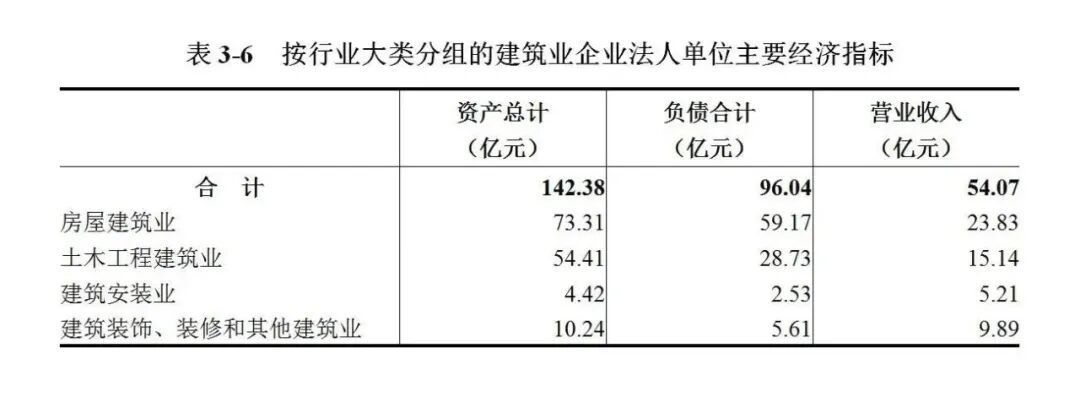 2023年末,建筑业企业法人单位资产总计142.38亿元,比2018年末增长81.1%;负债合计96.04亿元,比2018年末增长72.8%。