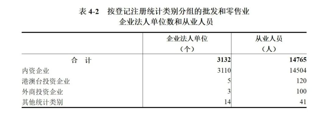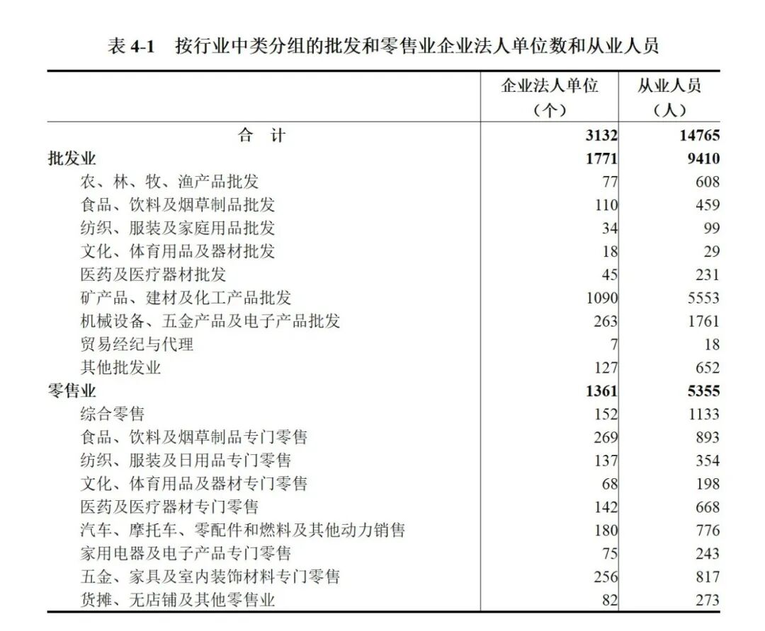 2023年末,全市共有批发和零售业企业法人单位3132个,从业人员14765人,分别比2018年末增长47.9%和56.4%。