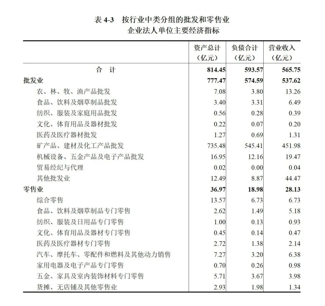 2023年,批发和零售业企业法人单位全年实现营业收入565.75亿元,比2018年下降33.7%(详见表4-3)。