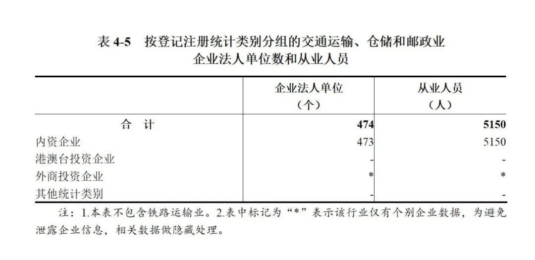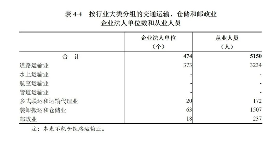 2023年末,全市共有交通运输、仓储和邮政业企业法人单位474个,从业人员5150人,分别比2018年末增长126.8%和4.8%(详见表4-4)。