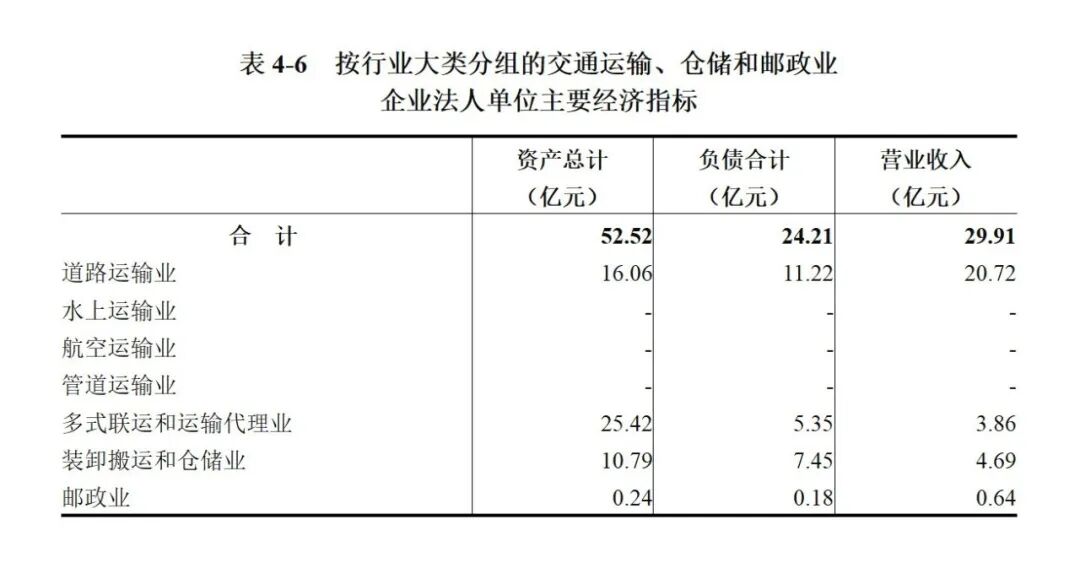 2023年末,交通运输、仓储和邮政业企业法人单位资产总计52.52亿元,比2018年末增长5.3%;负债合计24.21亿元,比2018年末下降24.4%。
