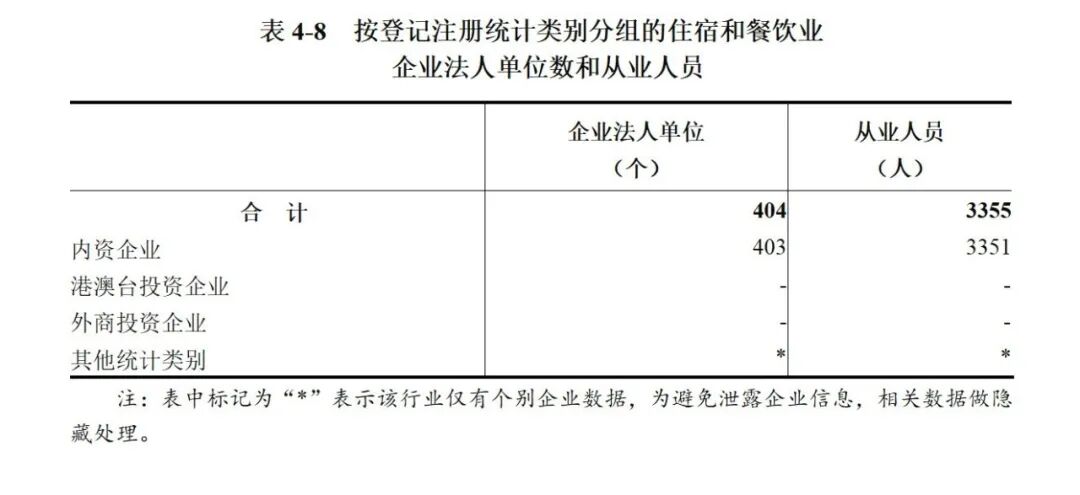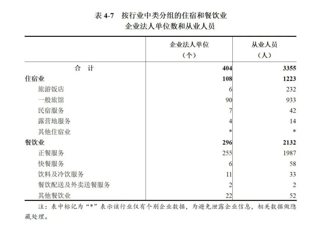 2023年末,全市共有住宿和餐饮业企业法人单位404个,从业人员3355人,分别比2018年末增长96.1%和43.0%。