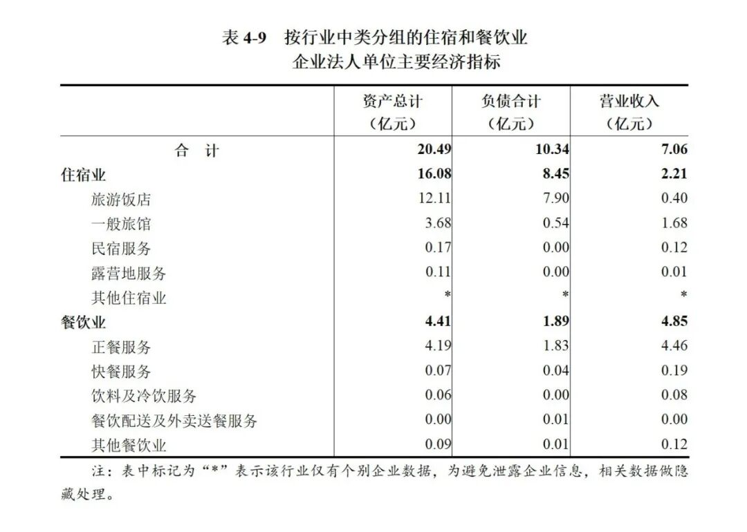 2023年末,住宿和餐饮业企业法人单位资产总计20.49亿元,比2018年末增长66.2%;负债合计10.34亿元,比2018年末增长36.1%。