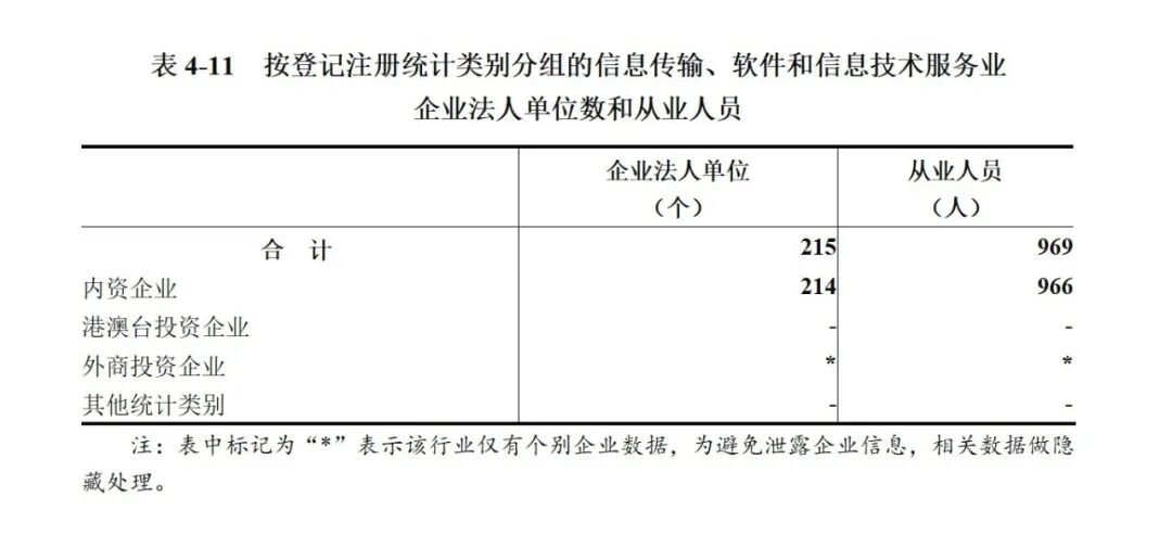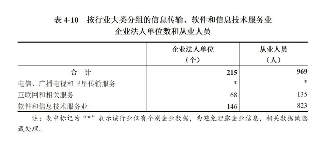 2023年末,全市共有信息传输、软件和信息技术服务业企业法人单位215个,从业人员969人,分别比2018年末增长65.4%和35.5%(详见表4-10)。