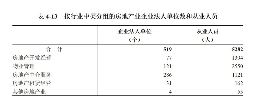 2023年末,全市房地产业企业法人单位从业人员5282人,比2018年末增长24.8%。其中,房地产开发经营企业1394人,比2018年末下降23.4%;物业管理企业2550人,房地产中介服务企业1121人,分别比2018年末增长26.1%和222.1%(详见表4-13)。