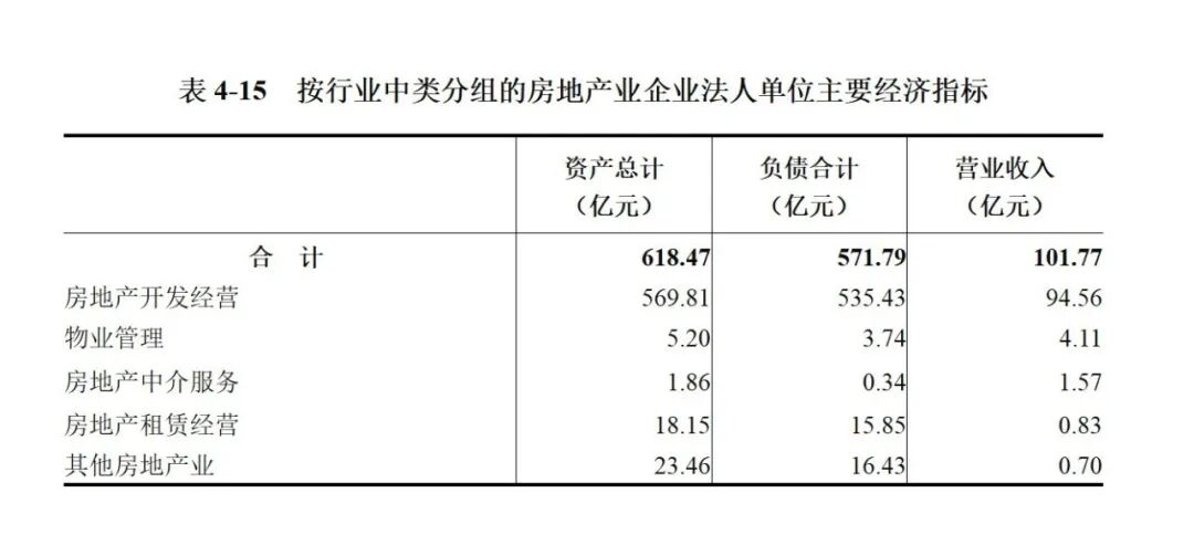 2023年末,全市房地产业企业法人单位资产总计618.47亿元,比2018年末增长34.4%。其中,房地产开发经营企业569.81亿元,物业管理企业5.20亿元,分别比2018年末增长35.6%、116.7%,房地产中介服务企业1.86亿元,比2018年末下降29.6%。房地产业企业法人单位负债合计571.79亿元,比2018年末增长45.6%。