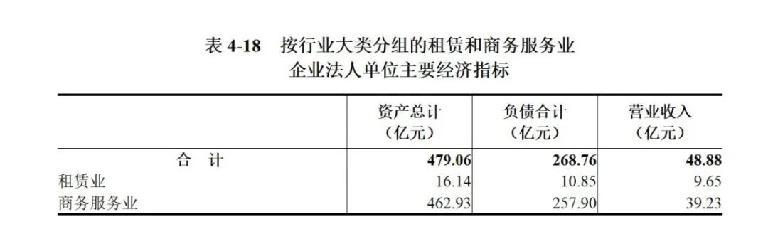 2023年末,租赁和商务服务业企业法人单位资产总计479.06亿元,比2018年末下降9.6%。其中,租赁业企业法人单位资产总计16.14亿元,比2018年末增长1083.8%;商务服务业企业法人单位资产总计462.93亿元,比2018年末下降12.4%。租赁和商务服务业企业法人单位负债合计268.76亿元,比2018年末下降25.0%。