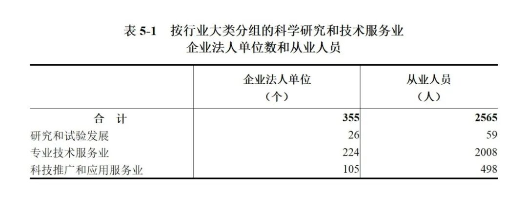 2023年末,全市共有科学研究和技术服务业法人单位367个,从业人员2727人,分别比2018年末增长77.3%和54.5%。其中,企业法人单位355个,从业人员2565人,分别比2018年末增长88.8%和62.8%(详见表5-1)。