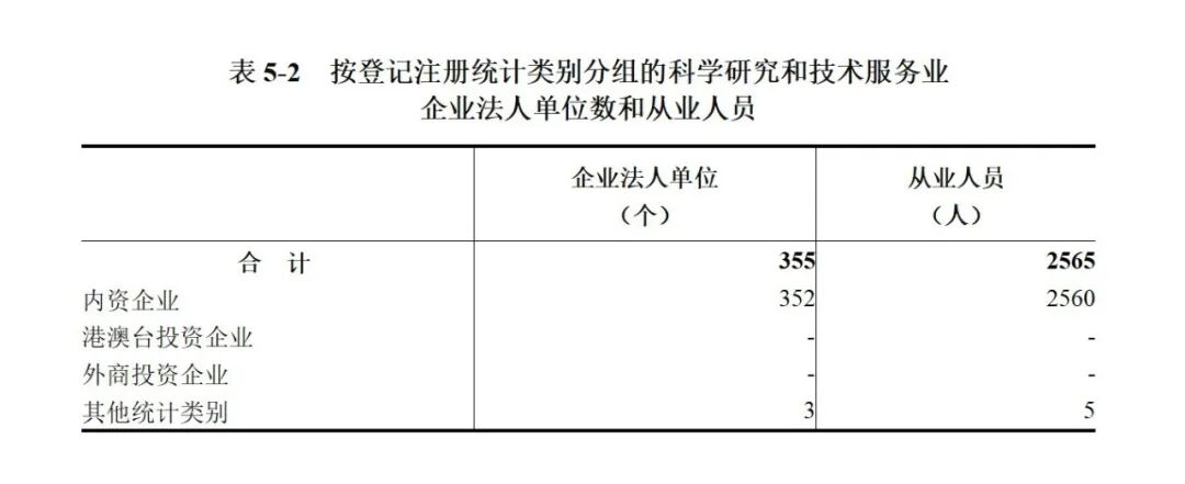 在科学研究和技术服务业企业法人单位从业人员中,内资企业占99.8%,其他统计类别占0.2%(详见表5-2)。