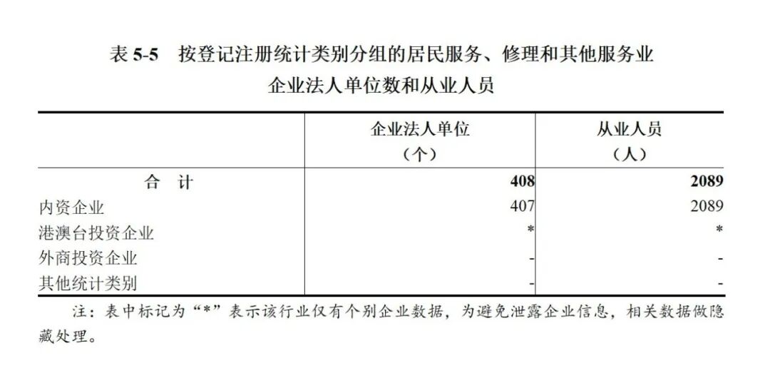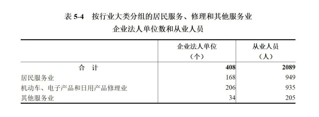 2023年末,全市共有居民服务、修理和其他服务业企业法人单位408个,从业人员2089人,分别比2018年末增长135.8%和99.1%(详见表5-4)。