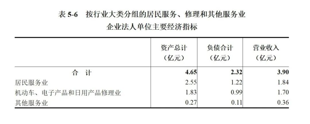 2023年末,居民服务、修理和其他服务业企业法人单位资产总计4.65亿元,比2018年末增长138.8%;负债合计2.32亿元,比2018年末增长445.2%。全年实现营业收入3.90亿元,比2018年增长169.0%(详见表5-6)。