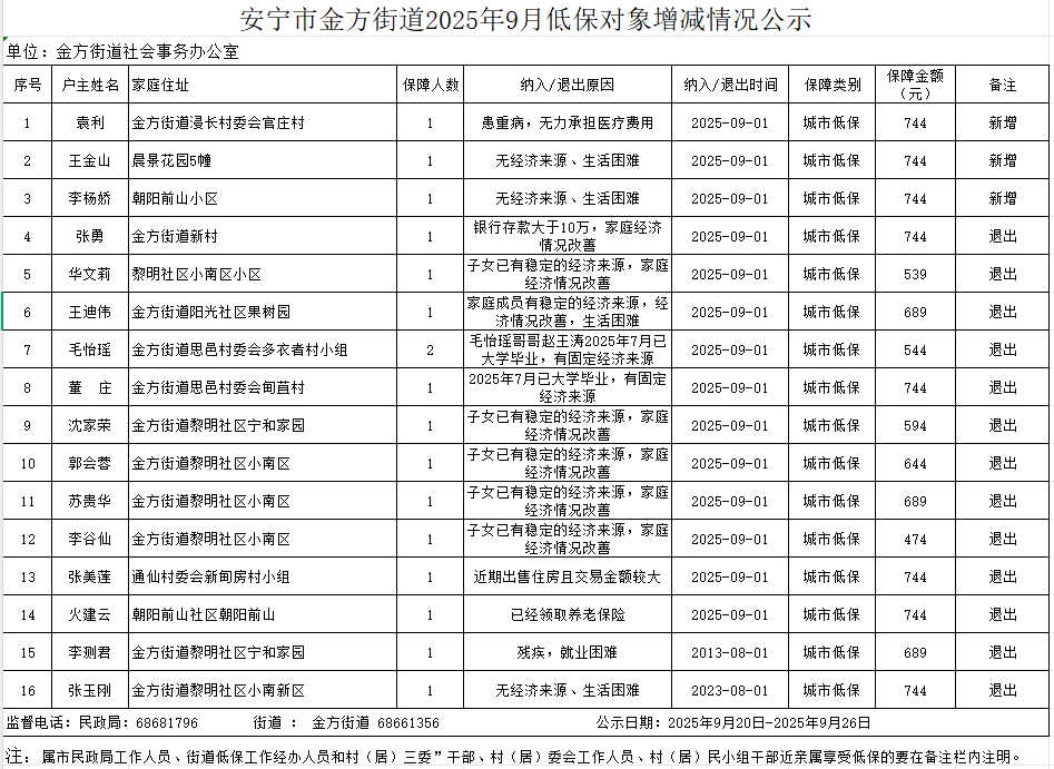 金方街道2025年9月低保对象增减情况公示