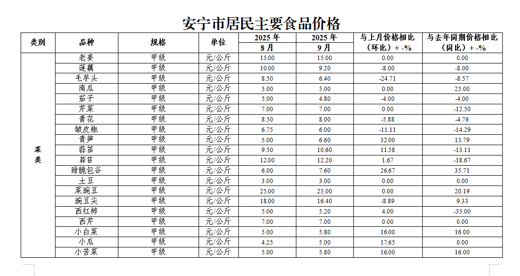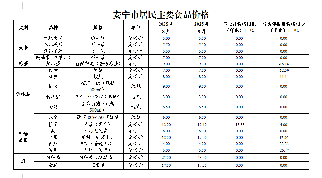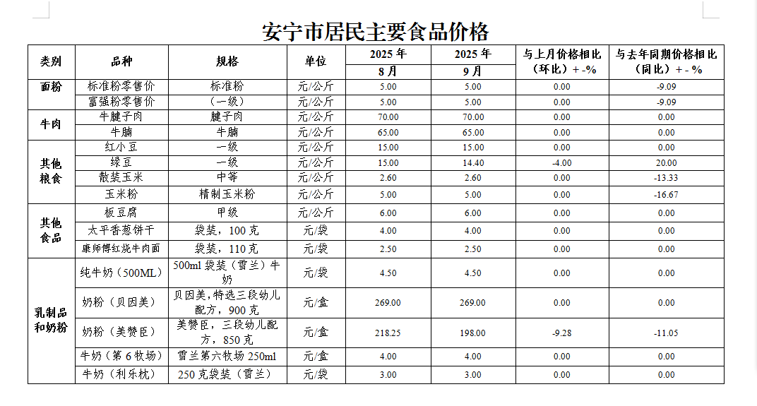 具体品种和价格情况见附表《安宁市主要居民食品价格》。