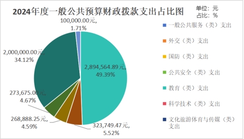 5.教育(类)支出2,894,564.89元,占一般公共预算财政拨款总支出的49.39%,完成年初预算的89.40%。主要用于行政运2,796,811.07元,一般行政管理事务97,753.82元;造成预决算差异的主要原因是2024年其他教育费附加安排的支出减少,故导致教育(类)支出决算数小于年初预算数。