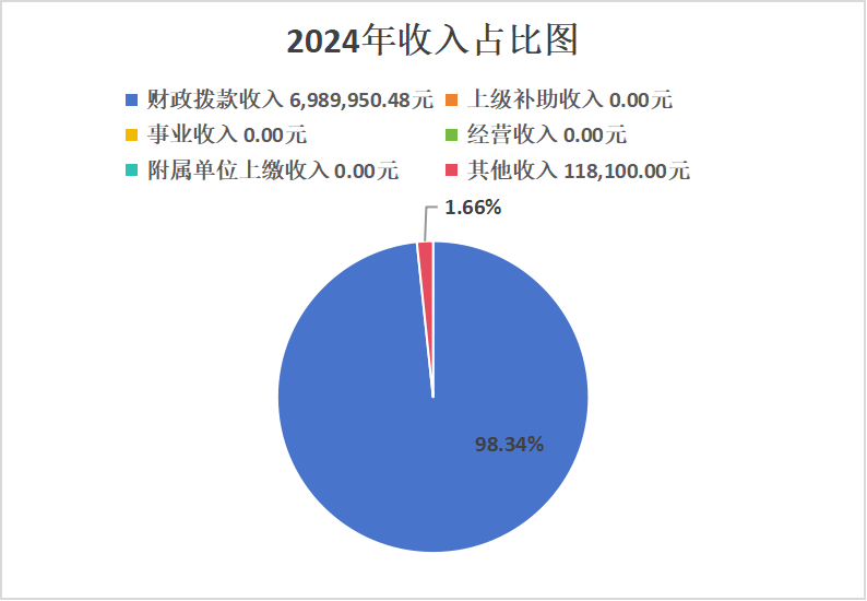 安宁市统计局2024年度收入合计7,108,050.48元。其中:财政拨款收入6,989,950.48元,占总收入的98.34%;无上级补助收入;无事业收入(含教育收费);无经营收入;无附属单位上缴收入;其他收入118,100.00元,占总收入的1.66%。