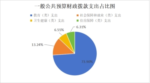 5.教育(类)支出9,392,233.29元,占一般公共预算财政拨款总支出的73.90%,完成年初预算的115.77%。主要用于教育管理事务方面,工资福利支出、商品和服务支出、对个人和家庭补助支出等;造成预决算差异的主要原因是2024年度小学生均公用经费调整,公用经费增加,故预决算存在差异。