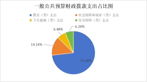5.教育(类)支出17,851,389.49元,占一般公共预算财政拨款总支出的73.14%,完成年初预算的120.31%。主要用于教育管理事务方面,工资福利支出、商品和服务支出、对个人和家庭补助支出等;造成预决算差异的主要原因是2024年新学期学生人数增加,公用经费等支出增加,故造成预决算存在差异。